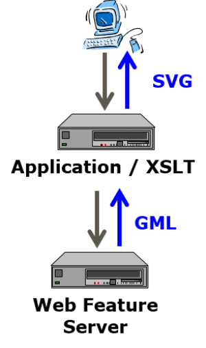 požadavek uživatele je poslán zpět do datového skladu GML → webový server extrahuje nové GML prvky → sestaví z nich SVG → tohle SVG pošle klientovi